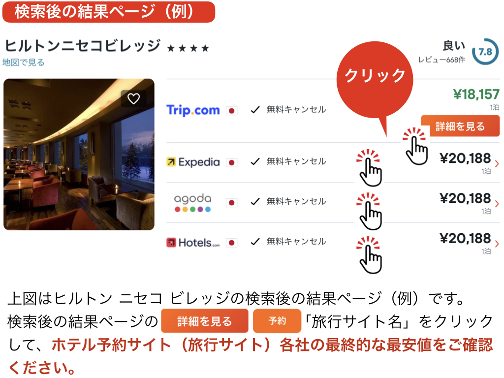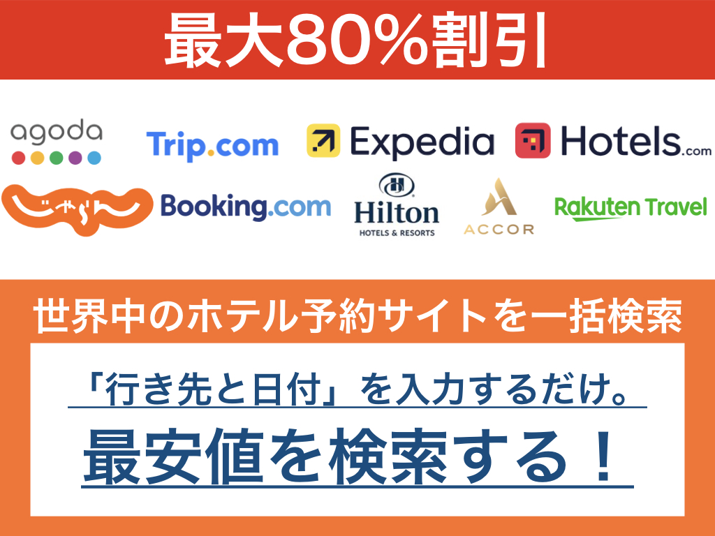 アゴダ・Booking.com・Expedia・Hotels.comなどホテル予約サイトの最安値(最大80%OFF)が簡単にわかります!